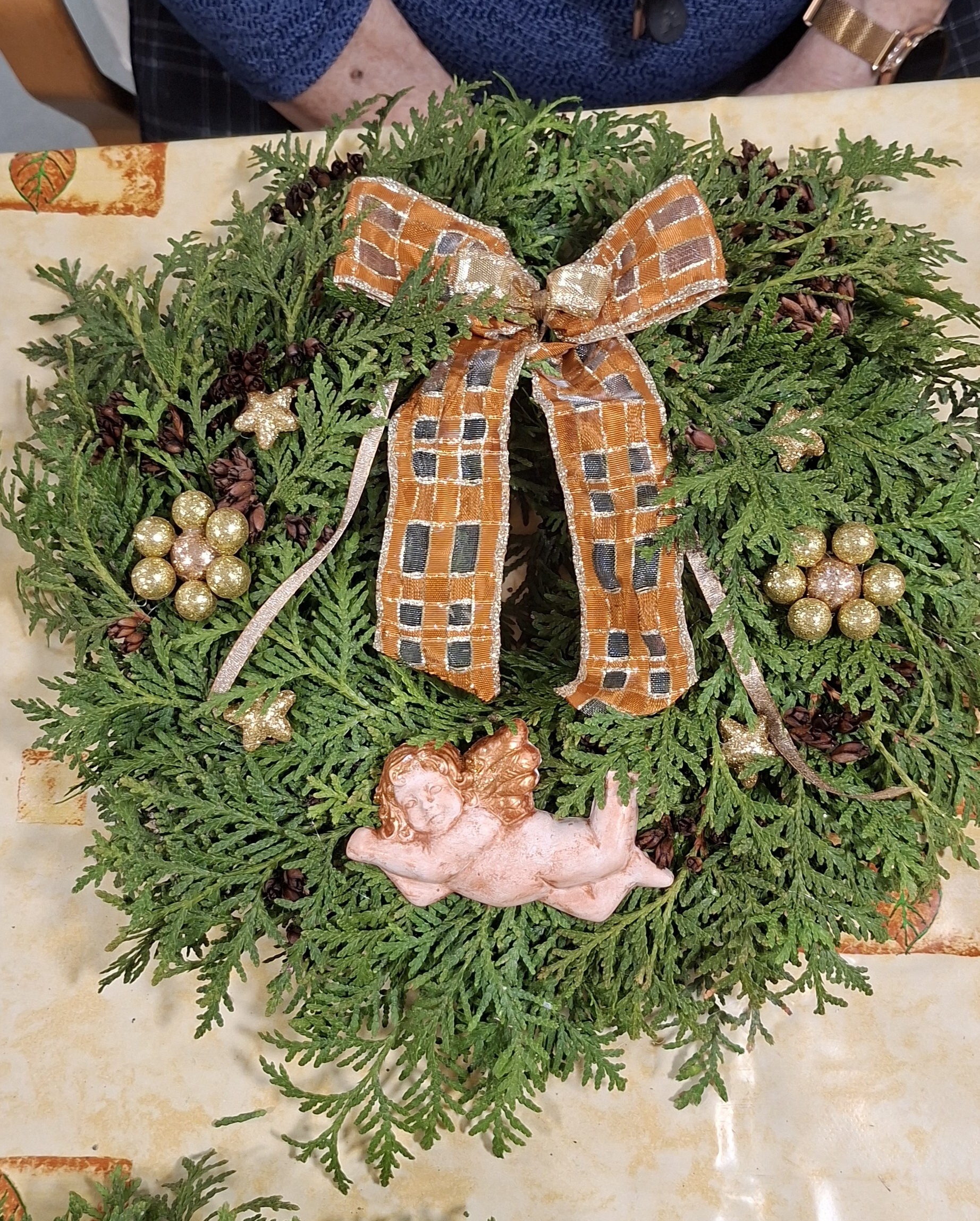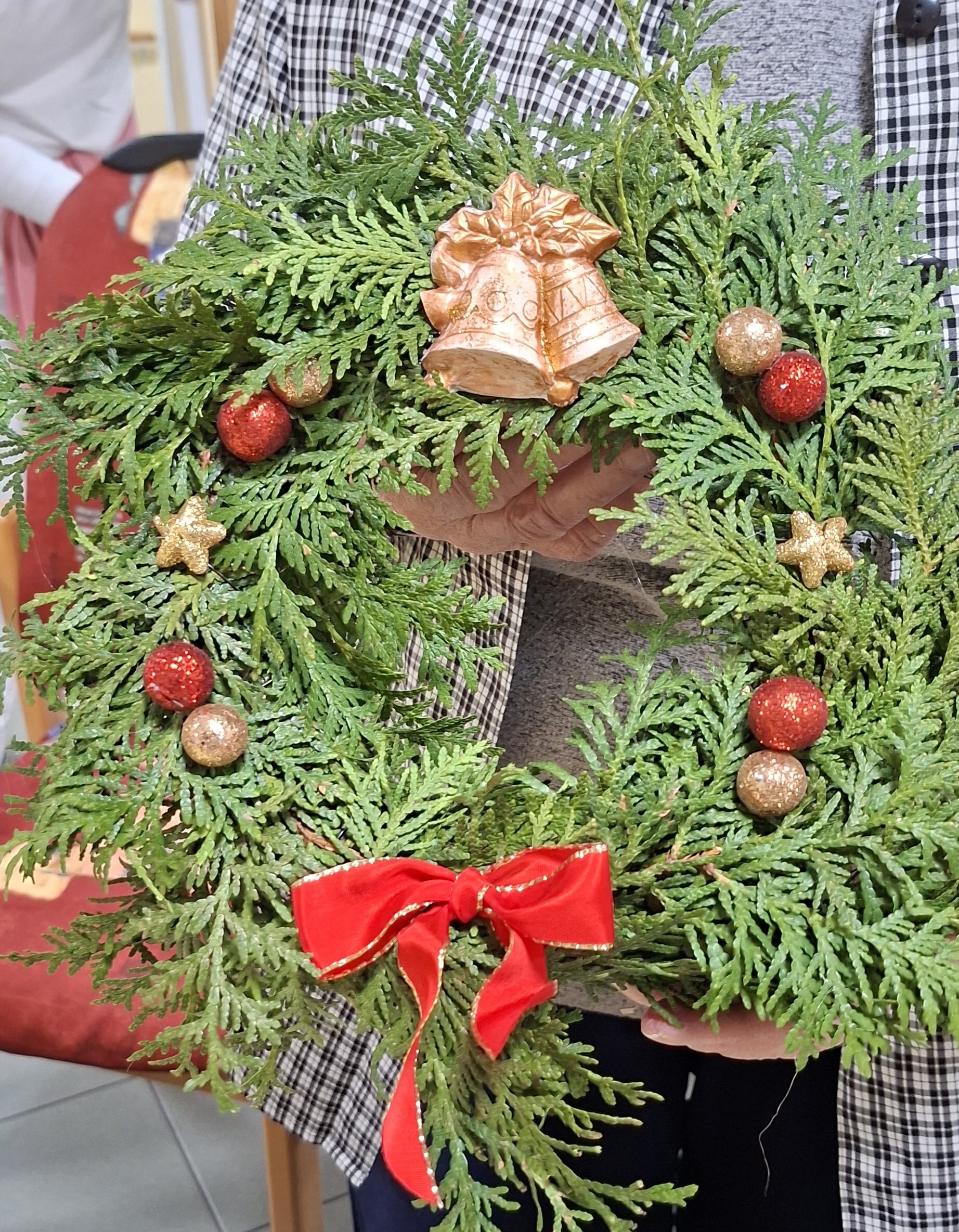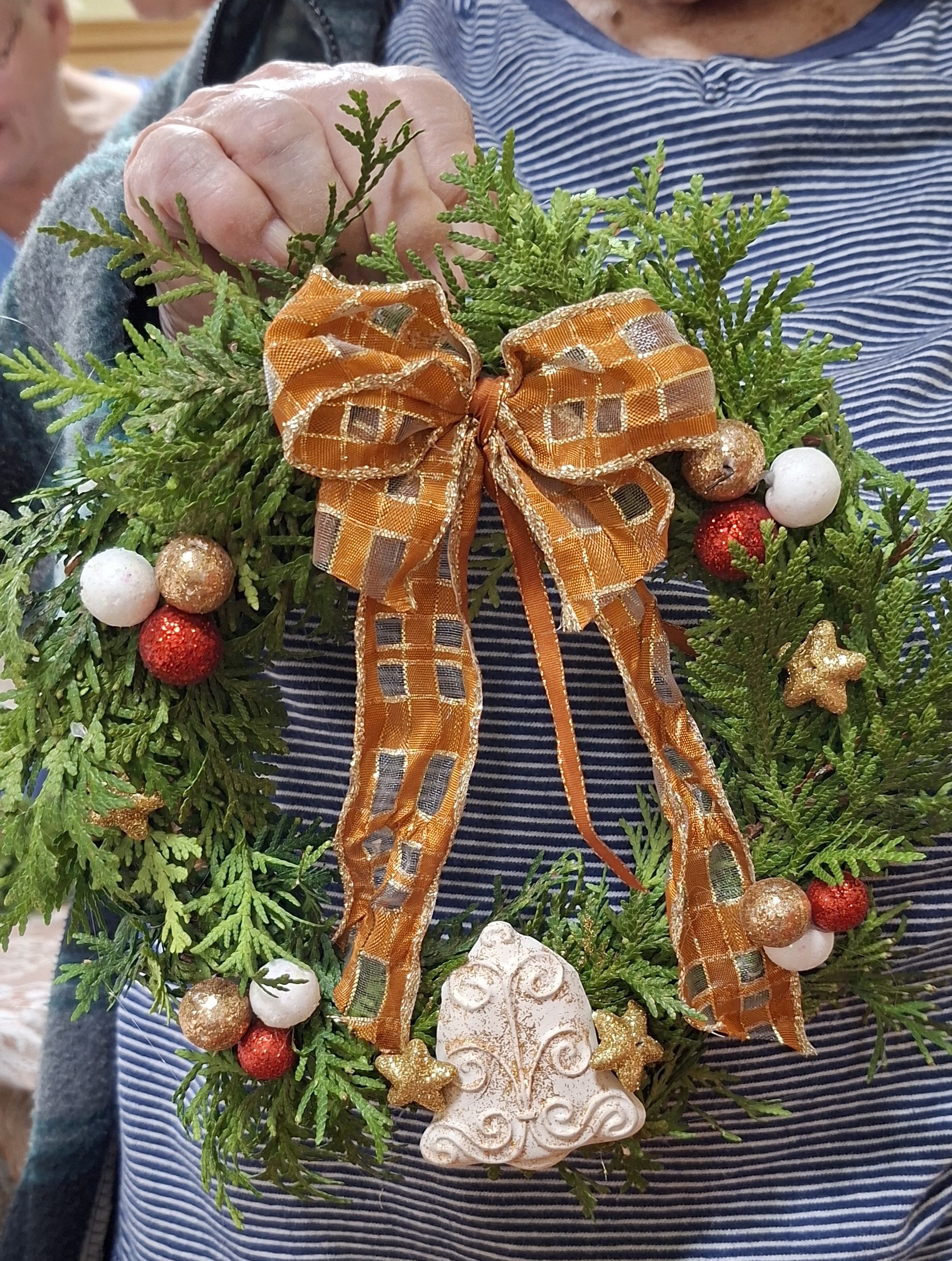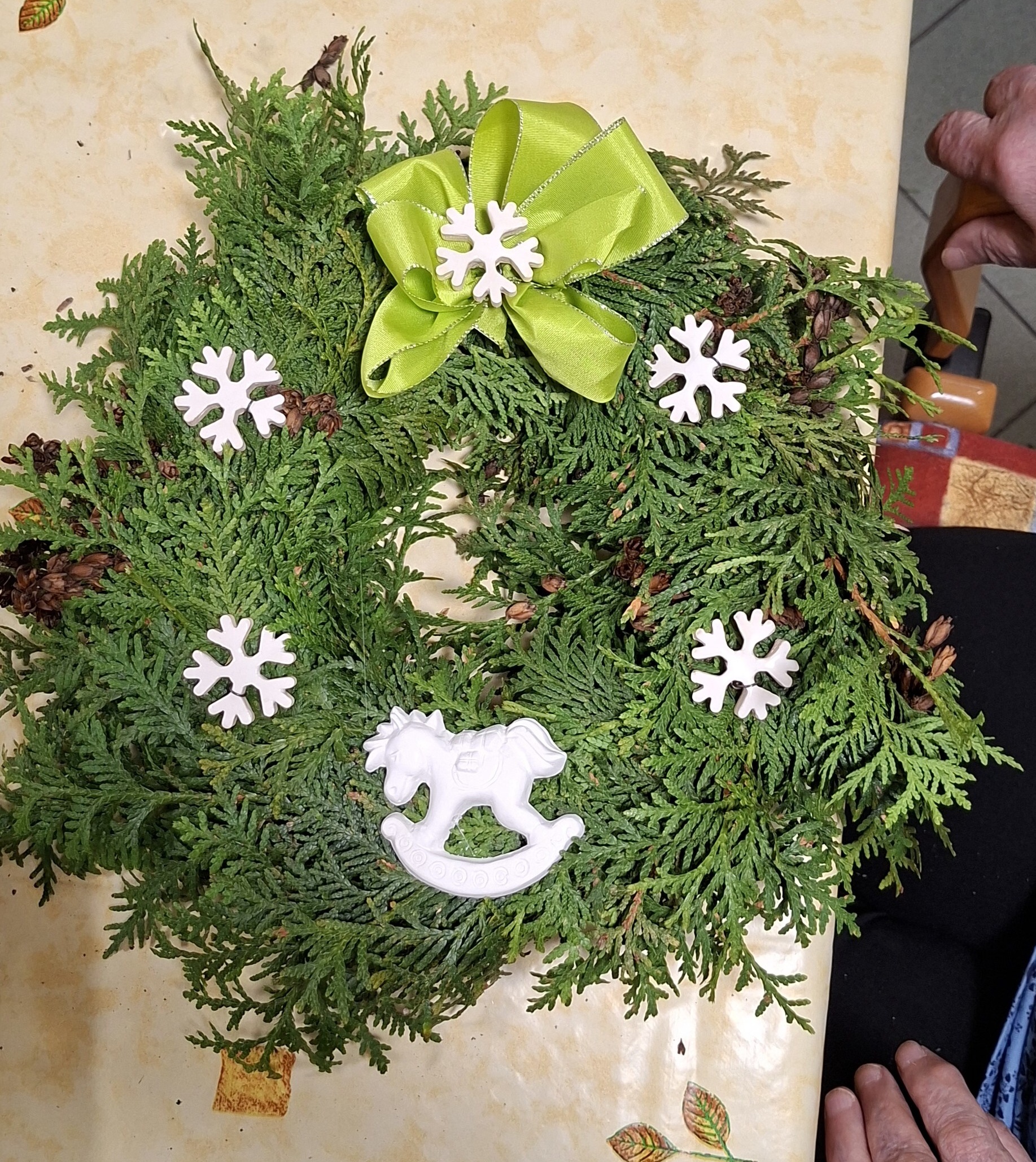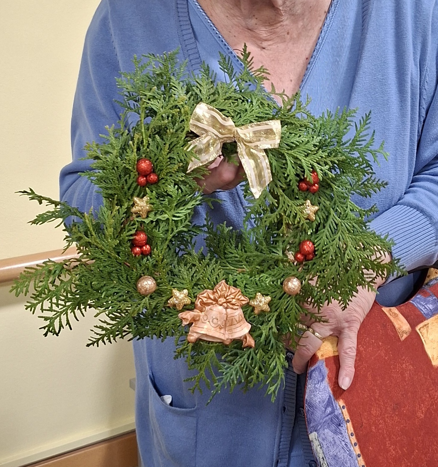Je konec listopadu a začíná advent. Ani letos jsme s uživateli nezapomněli vyrobit adventní věnce, které ozdobí dveře pokojů. Pro velký zájem jsme se museli rozdělit na tři skupiny. Túje z naší zahrady nám poskytly své větve a pak stačily jen šikovné ruce a věneček byl na světě.